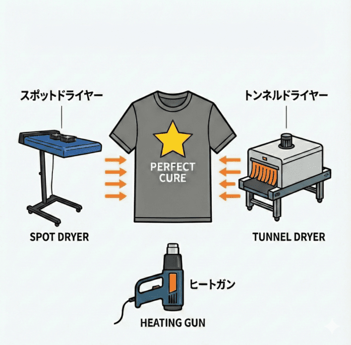 御社のインクを使用し、青いフラッシュドライヤー(プラテンから約3cm)で作業していますが、黒(マット)インクのみ熱処理時間が非常に短く(約8秒)設定されています。
