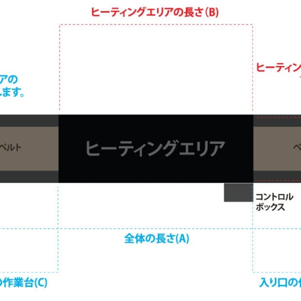 コンベア乾燥機の基本スペック 本体の長さ 約400cm(A) 本体の幅 約70cm(入り口、出口の幅は約55cm) 入り口の作業台:出口の作業台 約105cm(B):約105cm(C) 本体サイズ 高さ 約120cm 用…
